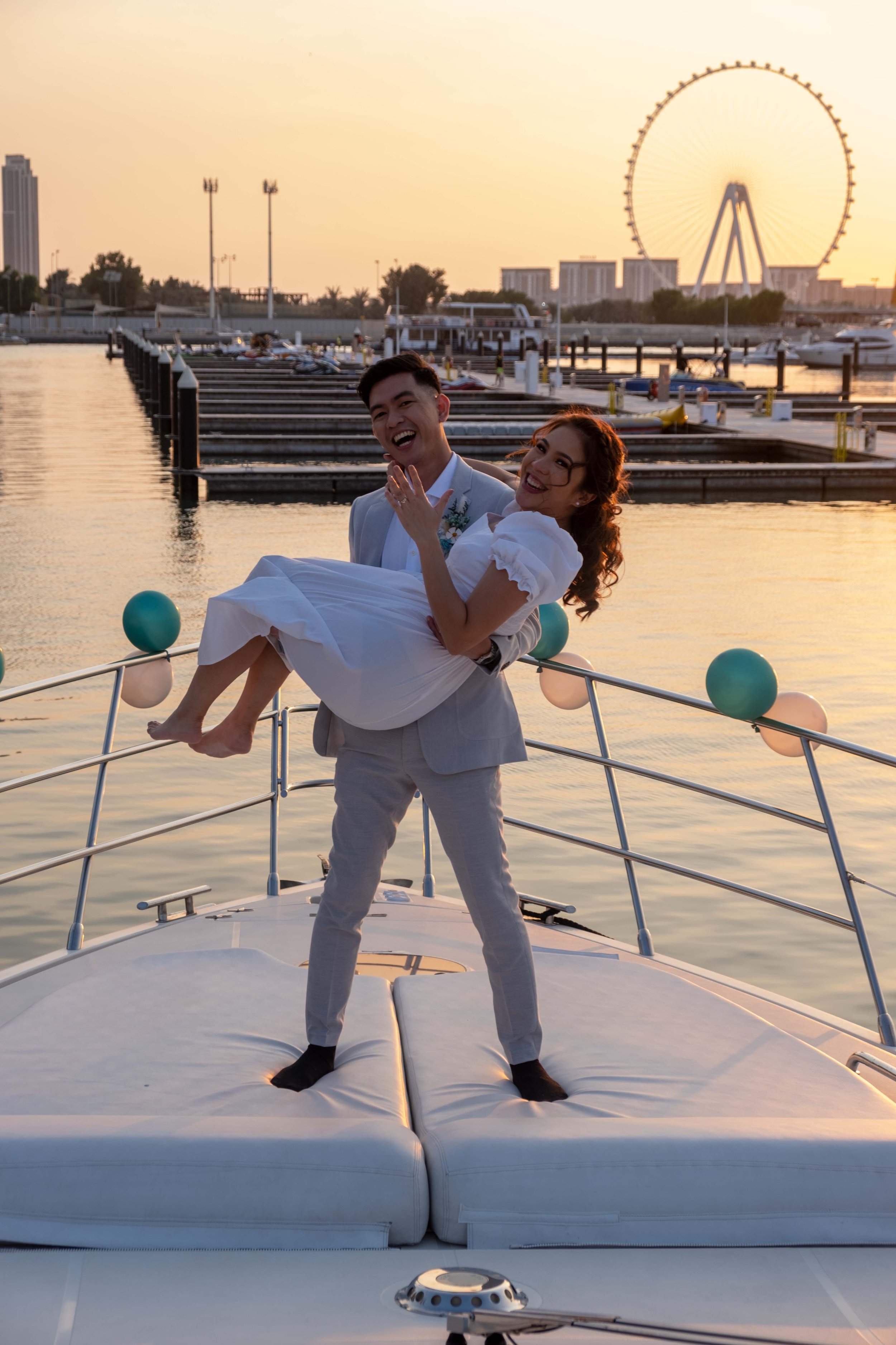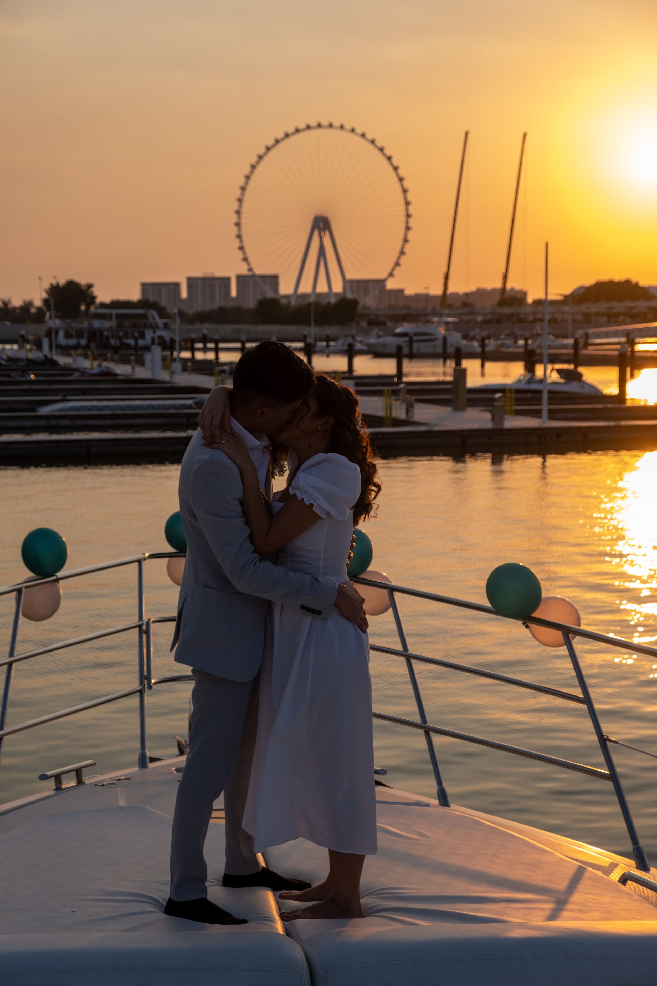A happy couple in white and light gray outfits hugging on the bow of a yacht at sunset, with a marina, boats, and a Ferris wheel in the background.